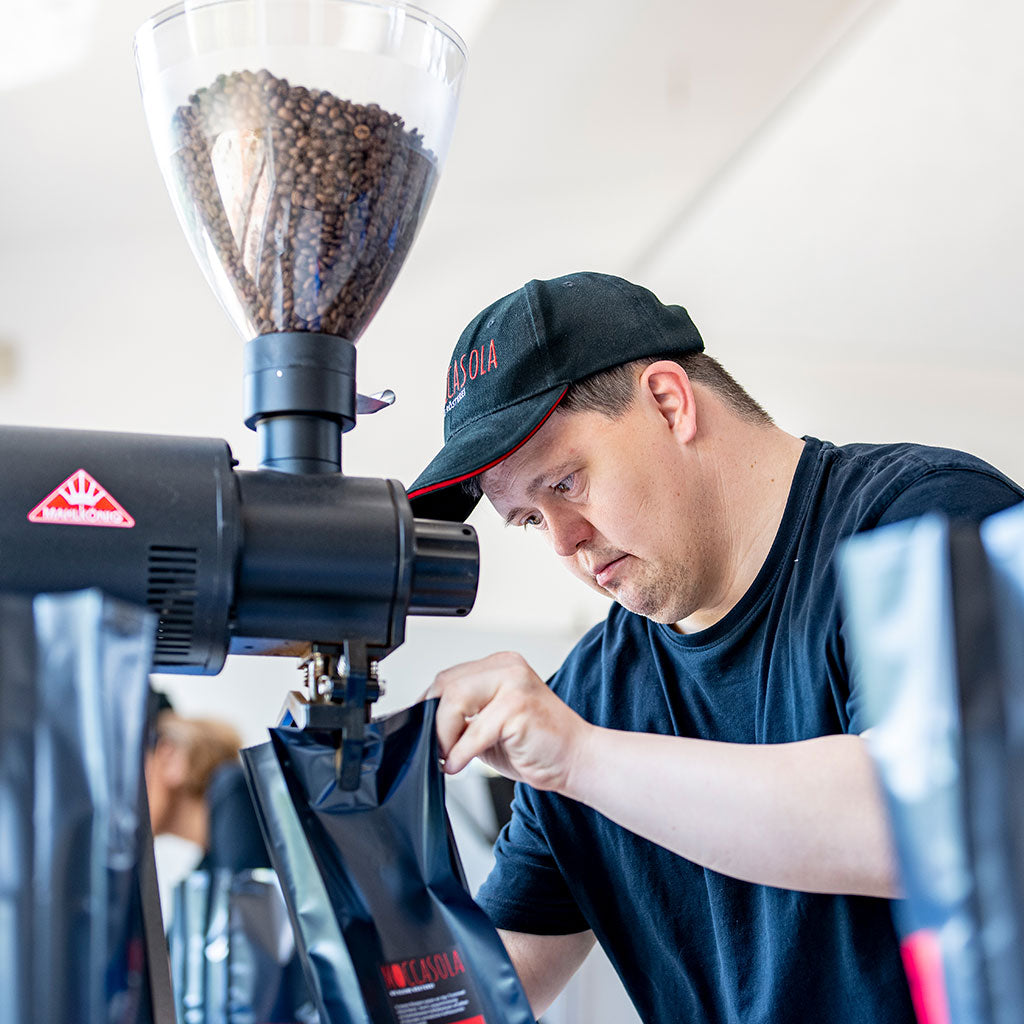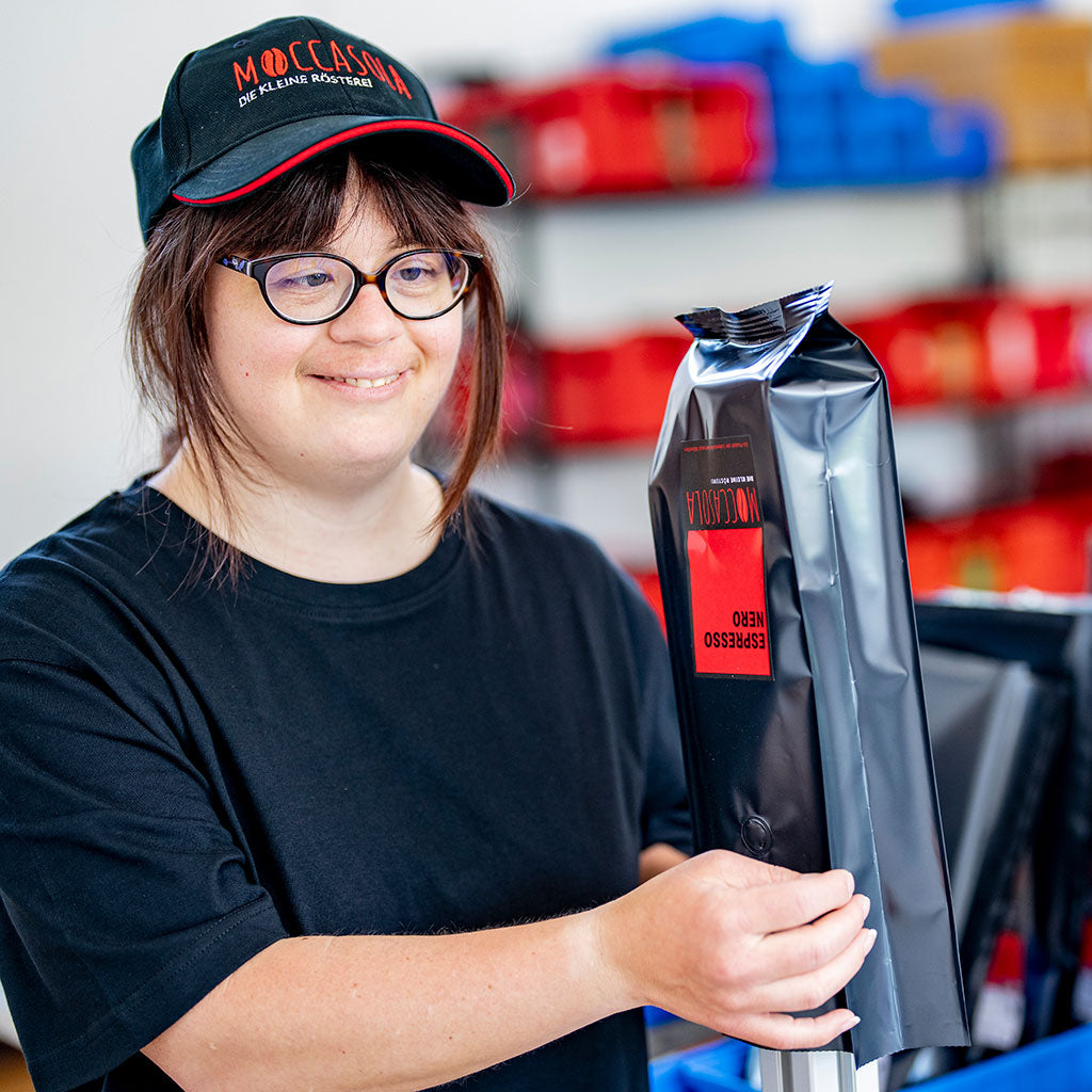 Unsere Hauptintention ist die Schaffung von Arbeitsplätzen für Menschen mit Behinderung und ihre Teilhabe am Arbeitsleben. In unserer Rösterei bieten wir verschiedene Arbeitsplätze für etwa 30 Mitarbeiter an. Die Aufgaben fangen vom handverlesen der Bohnen samt Qualitätskontrolle an, dem Abwiegen der Kaffee- oder Espressosorten und je nach Bestellung, dem Aufkleben der einzelnen Etiketten und zum Schluss dem Versenden.